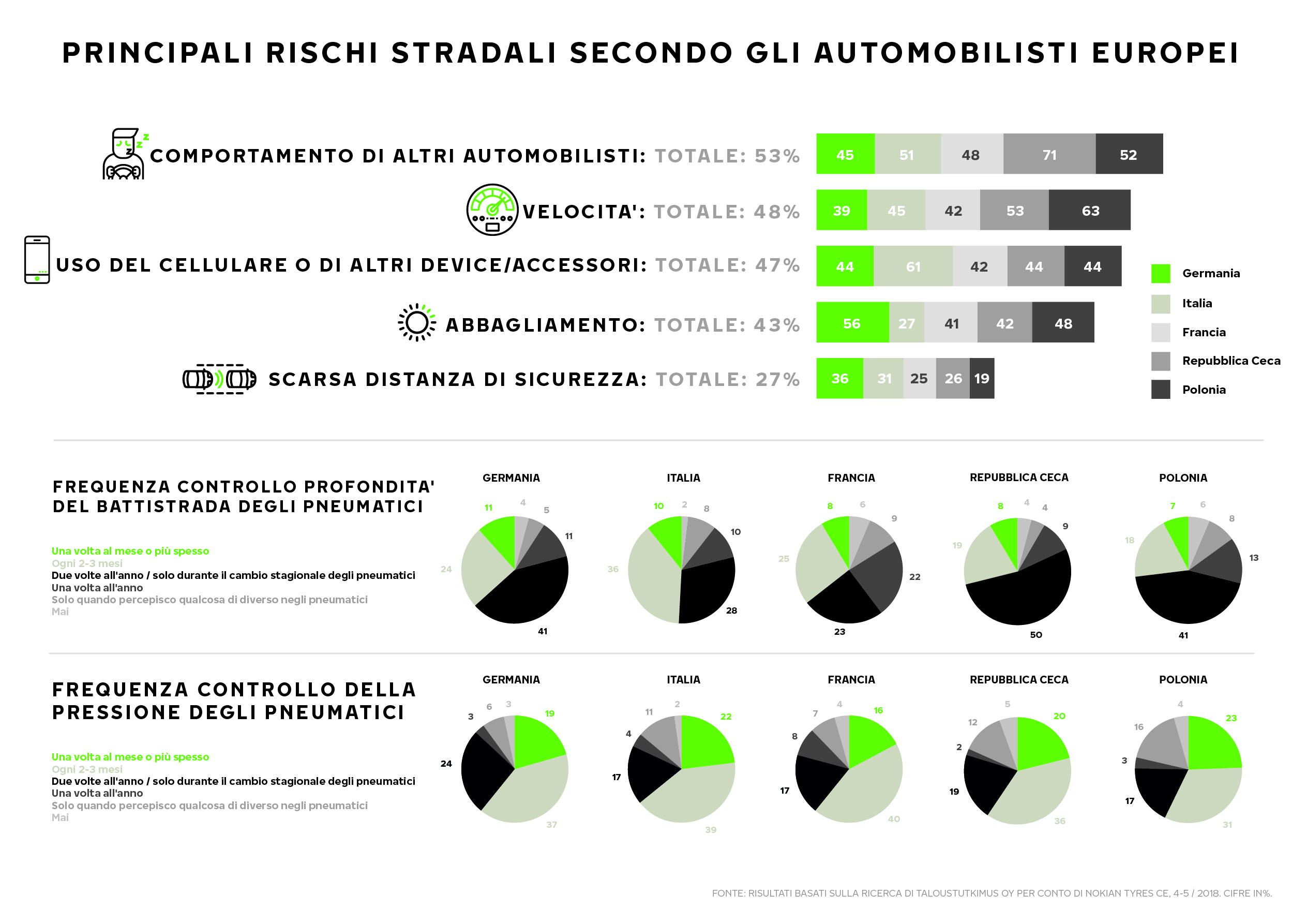 Secondo la survey di Nokian Tyres, la percezione di un rischio più elevato sulle strade nel periodo estivo è causata dal comportamento degli altri automobilisti, dalla velocità eccessiva e dall’uso del telefono alla guida. Gli italiani, i cechi e i polacchi sono coloro che hanno meno fiducia negli altri automobilisti.
